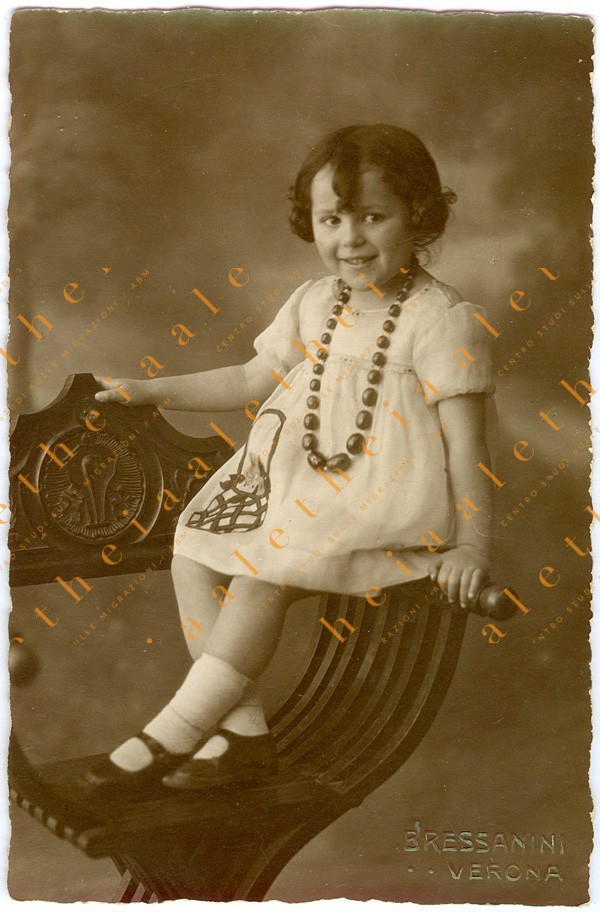 Foto che ritrae Gigina, la bambina veronese di cui Angela D’Incà (di Trichiana) è stata balia nel 1922. Sul retro: “Alla mia cara balia con tanto affetto. Gigina. 4 maggio 1929”.
