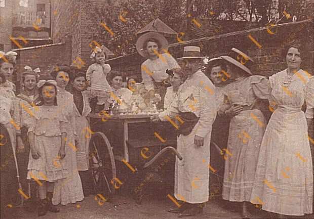 Bytom (Polonia), primi anni del ‘900. Il carretto dei gelati di Belfi Luigi Longo, di Vodo di Cadore, richiama numerose donne e bambine. (Per gentile concessione di Belfi Luigi Longo).