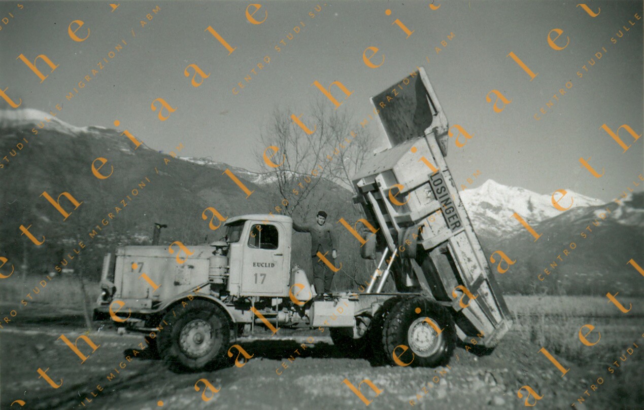 Canton Vallese, Svizzera, 1957-58 circa. Ferruccio Sommacal al lavoro. Lavorava alla costruzione della diga di Moiry.