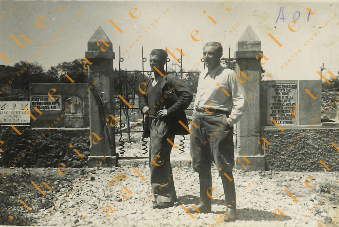 Beniamino Bez, a sinistra, con un connazionale davanti al cimitero militare di Dembeguinà.