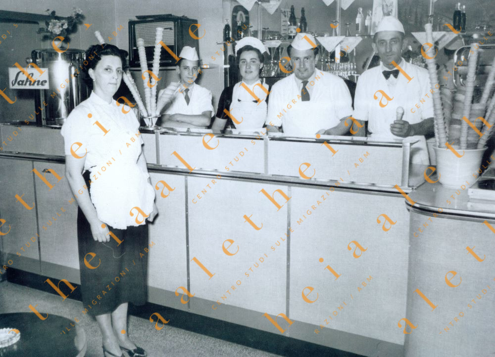 Düsseldorf (Germania), 1955. Lo staff della gelateria Eis Salon De Pellegrin. (Per gentile concessione della Famiglia ex Emigranti del Longaronese).