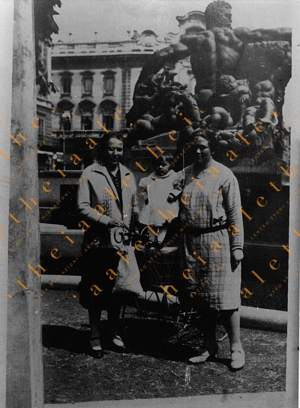 Torino, anni ’30. A destra Elvira Capraro di Cet, balia “da latte” presso la famiglia Segre.