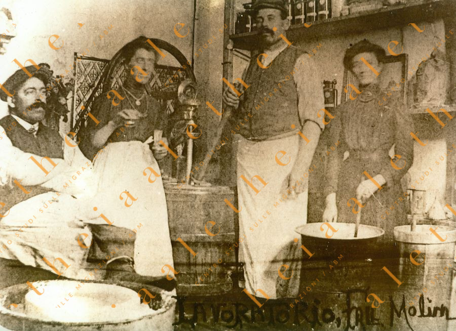 La Famiglia Molin Pradel (Renzo) nel laboratorio della loro gelateria a Vienna (Austria) nei primi anni del secolo scorso. (Per gentile concessione della Famiglia ex Emigranti del Longaronese).