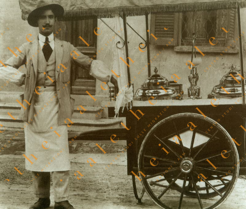 Arona (Novara), 1920. Gelatiere con il tipico carrettino. (Archivio Famiglia ex emigranti del Longaronese).