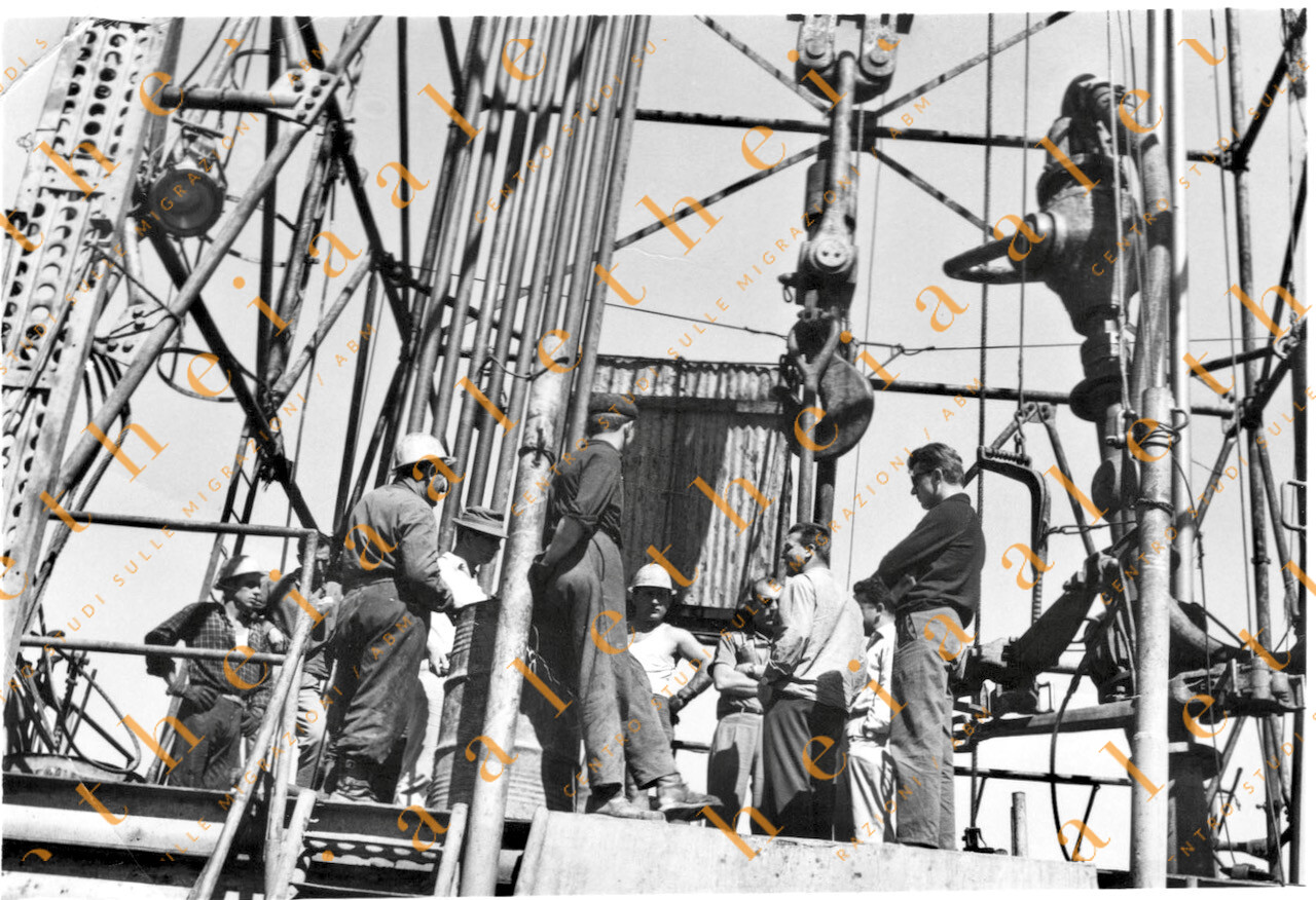 Provincia di Enna, 1961. Impianto di perforazione dell’Agip. Al lavoro anche alcuni bellunesi, tra cui il perito minerario agordino Giovanni Rivis, assunto con la qualifica di geologo di cantiere.