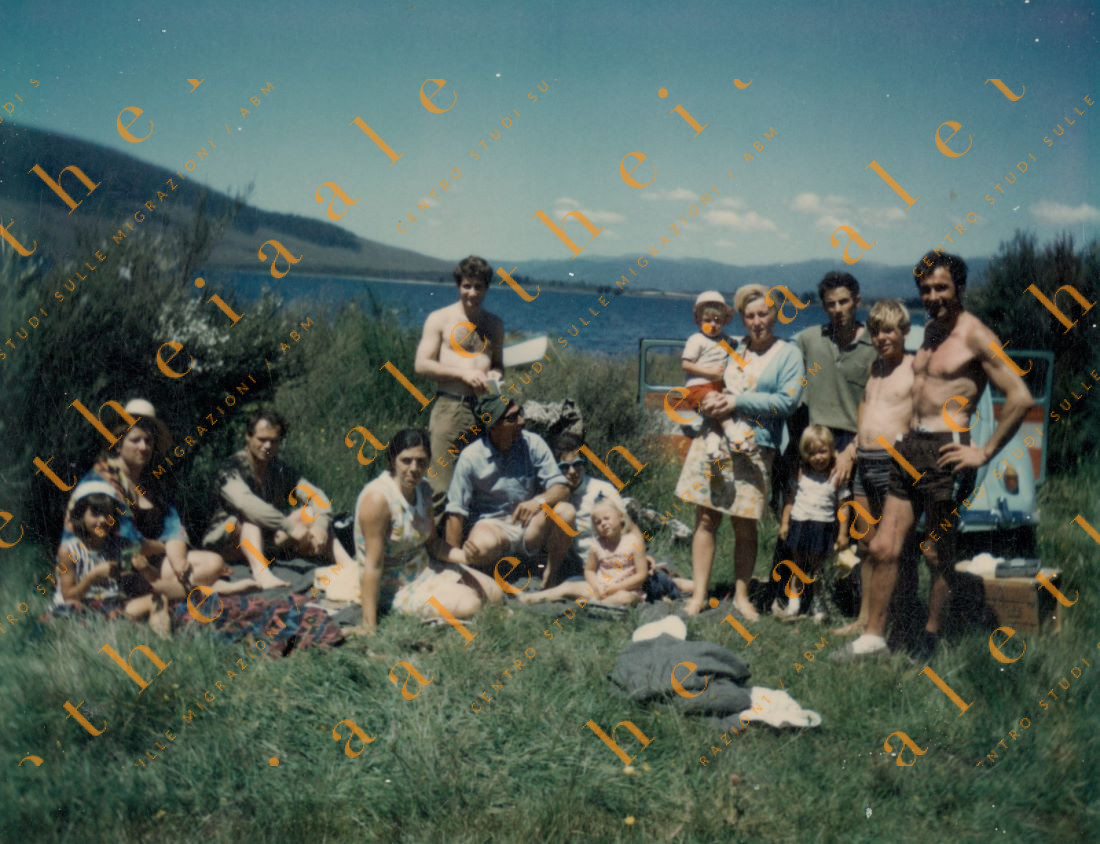 Lago Rotoaira, (Nuova Zelanda), 1969. Lavoratori del cantiere di Tawhitikuri, con le rispettive famiglie, in gita al lago per trascorrere una giornata di relax. (Per gentile concessione di Arturo Soligo).