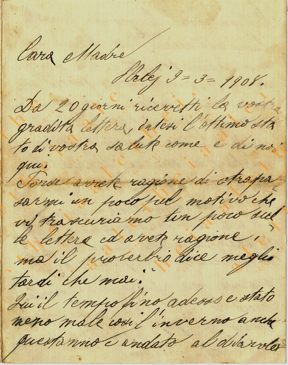Da 20 giorni ricevetti la vostra gradita lettera, intesi l’ottimo stato di vostra salute come e di noi qui.