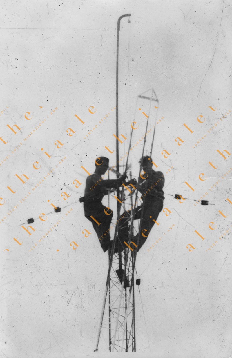 Macapá, 4 marzo 1968. Particolare del sollevamento di un pezzo di 5 metri di un’antenna radio alta 60. In cima all’antenna, a destra, il bellunese Italo Pierobon.