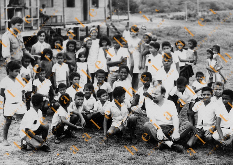 Carmon, 12 maggio 1968. Il bellunese Italo Pierobon (in alto a sinistra), assieme a Padre Sandro (in basso a destra con la barba) e a dei bambini del luogo in un villaggio a circa 100 km da Macapá. L’edificio in secondo piano è la scuola del villaggio.