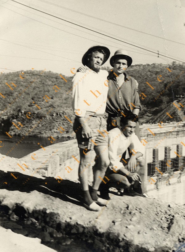 Kariba, 1959. Da sinistra, in piedi: Menarini, di Erto, Brillantino Furlan, di Termine di Cadore; in basso, Bernardo Agnoli. Sullo sfondo la diga. (Per gentile concessione di Brillantino Furlan)
