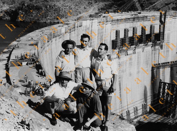 Kariba, 1959. Donnino Collavino, Bernardo Agnoli, Angelo Zangrando, Brillantino Furlan, Simone Riccobon: lavoravano alla costruzione della diga visibile alle loro spalle.