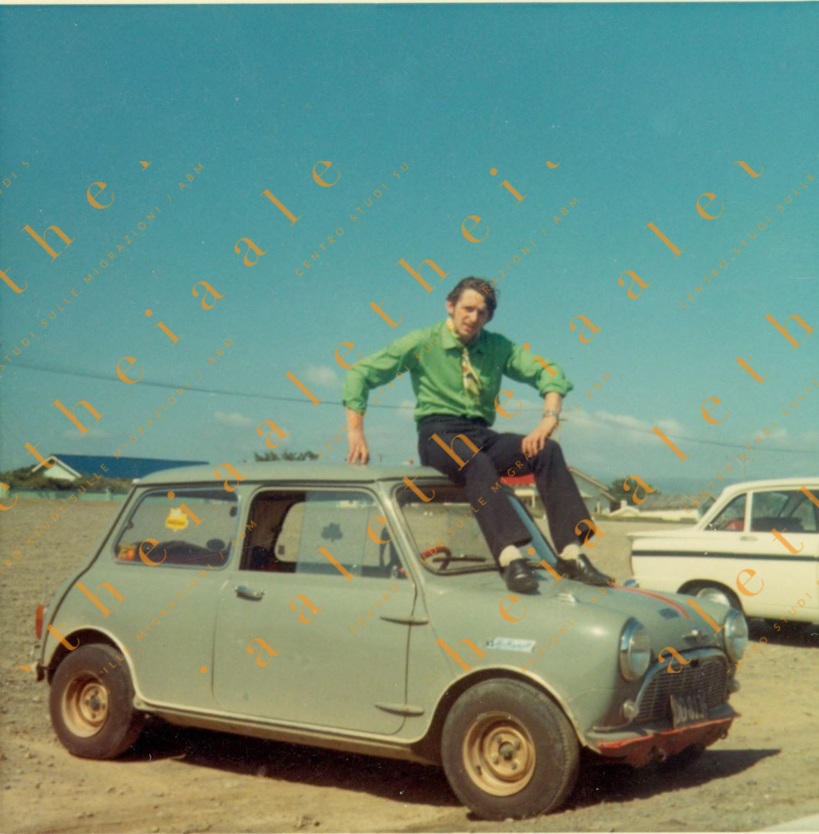 Cantiere Monfanga, Nuova Zelanda, 1970. Franco Dal Mas seduto sul tetto della sua Mini Minor color verde militare. (Per gentile concessione di Franco Dal Mas).