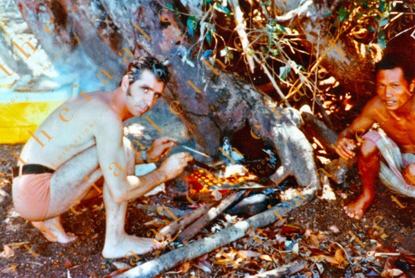 Isola Sulawesi (Indonesia), anni ’70. Claudio Pocaterra, di Sedico, dà lezioni di gastronomia a un indigeno Malese.