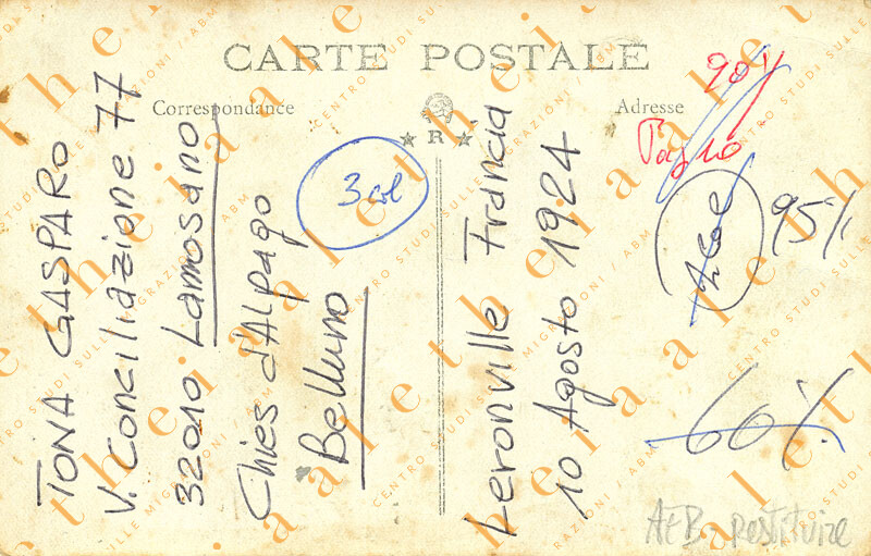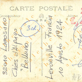 Lironville (Francia), 10 agosto 1924. Come si evince dal retro, la fotografia è stata spedita dalla Francia in Italia, a Gasparo Tona, di Chies d’Alpago.