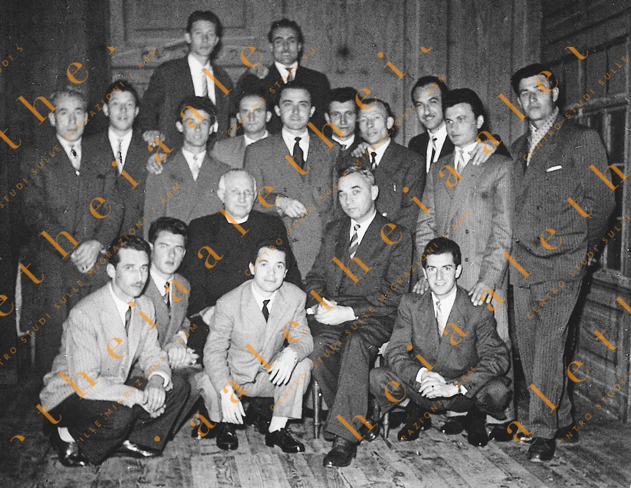 In posa dopo una rappresentazione della filodrammatica “Dante Alighieri” data a Rapperswil nel 1954. Al centro il missionario don Giuseppe Rampo con Mario Benvenuti, di Lamon, accanto a lui (il secondo da sinistra della prima fila.)