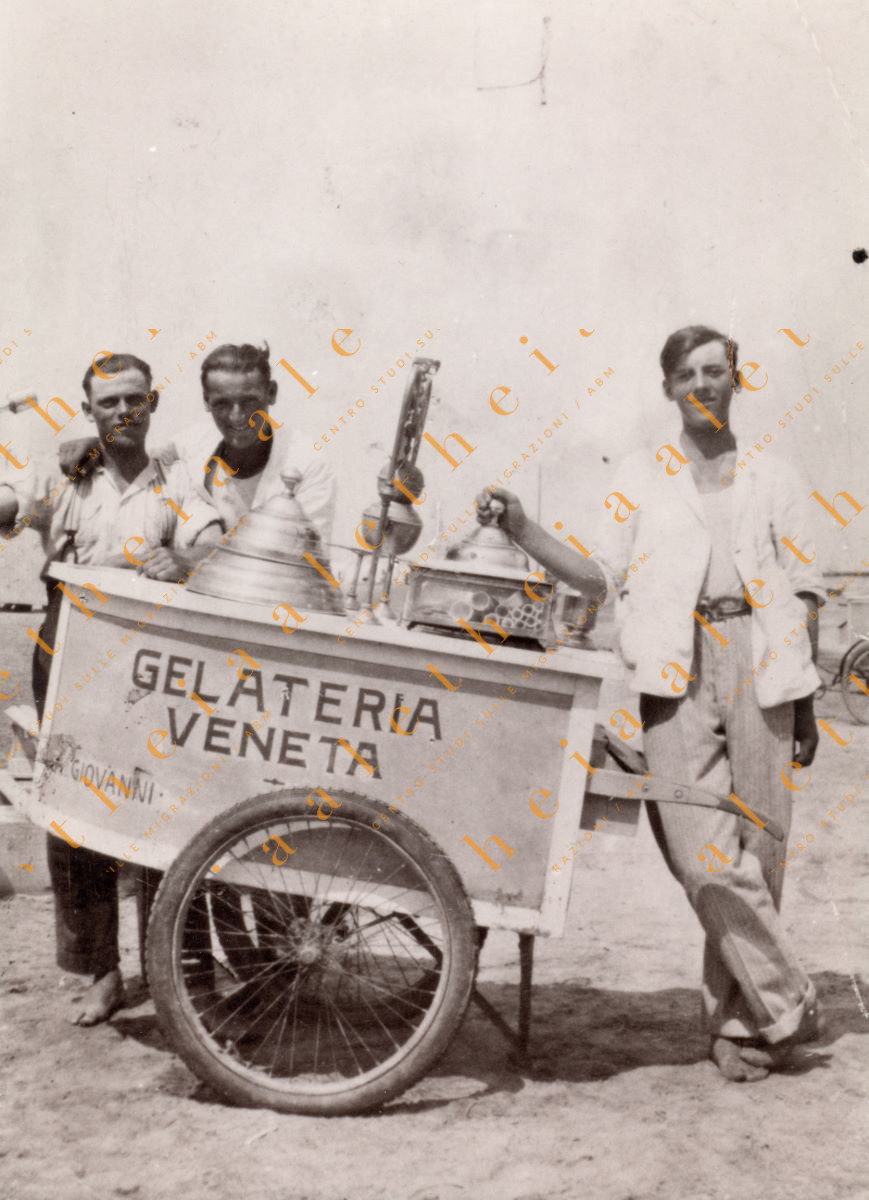 Cervia (Ravenna), Estate 1955. Romano Bez, Ferruccio e Valentino De Cesero, sul litorale di Cervia, con il tipico carrettino della Gelateria Veneta. (Per gentile concessione della Famiglia ex Emigranti del Longaronese).