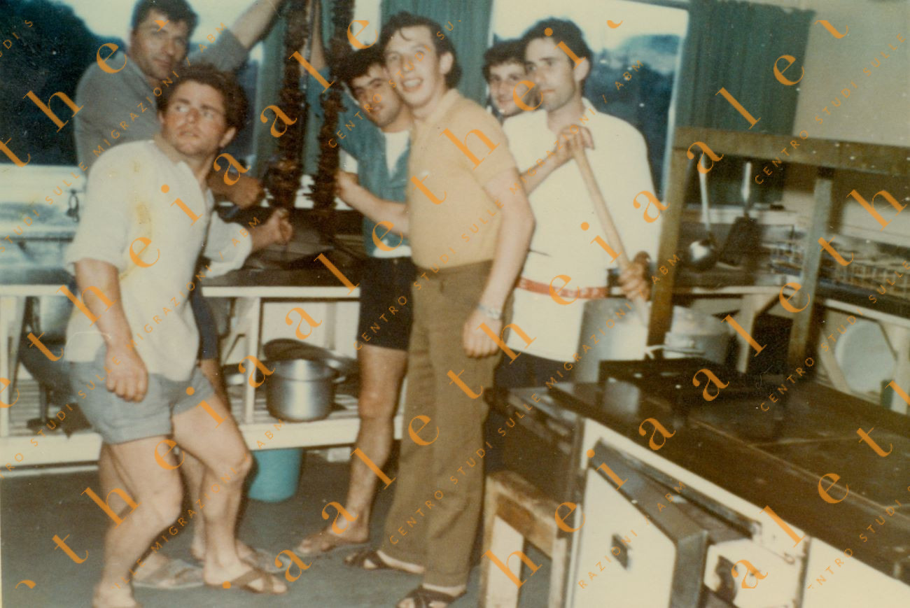 Il personale di cucina in una foto di gruppo: da sinistra, Troian di Sospirolo, dietro di lui Baliana, di Pieve di Soligo, Danilo Lorenzon, trevisano, Antonio Bottega di Fregona, Arturo Soligo di Ponte nelle Alpi e Roberto Cian di San Gregorio nelle Alpi.